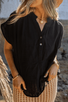 Details like the shell-button V-neck, capped sleeves, and gentle gathers at the shoulder give it a subtle sophistication that works just as well with denim as it does over swim.