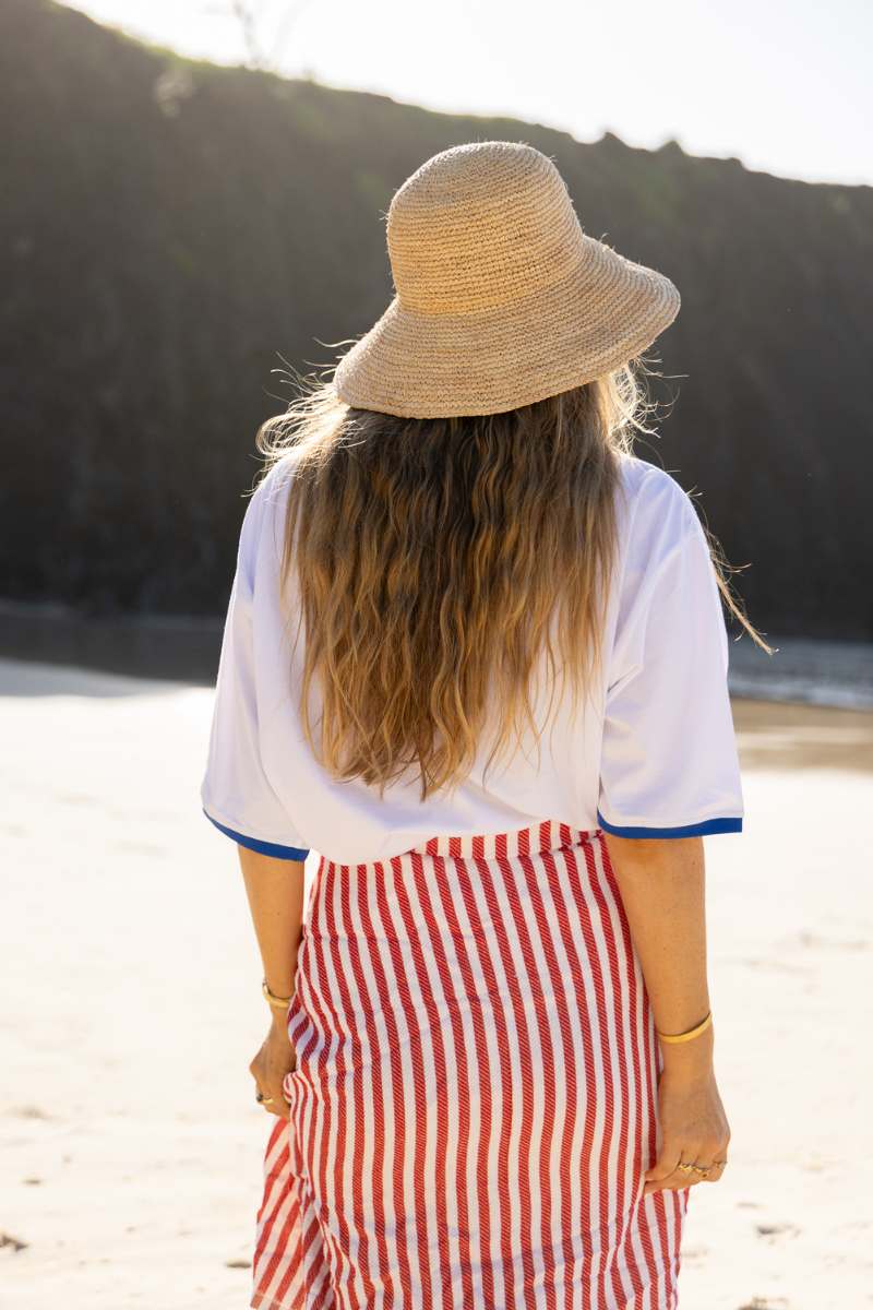 Finished with a blue ringer neckline and arm detailing, it brings a subtle retro edge, while the water-based print creates a soft, worn-in look inspired by our best-selling Euro Summer print.